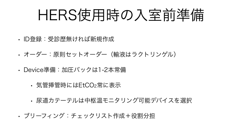 #4. HERS使用時の入室前準備 • ID登録:受診歴無ければ新規作成 • オーダー:原則セットオーダー(輸液はラクトリンゲル) • Device準備:加圧バックは1-2本常備 • • 気管挿管時にはEtCO2常に表示 • 尿道カテーテルは中枢温モニタリング可能デバイスを選択 ブリーフィング:チェックリスト作成+役割分担
