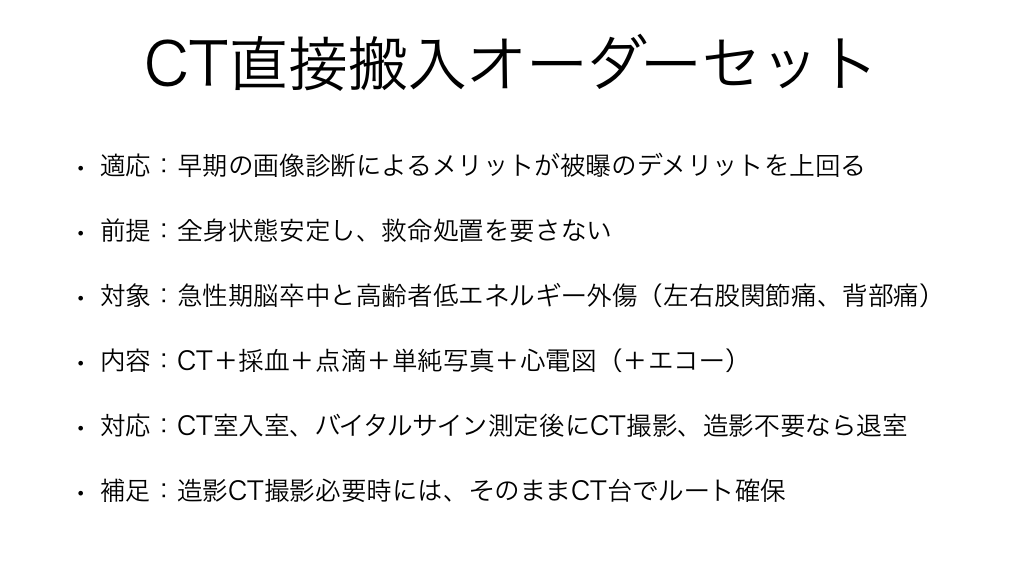 #5. CT直接搬入オーダーセット • 適応:早期の画像診断によるメリットが被曝のデメリットを上回る • 前提:全身状態安定し、救命処置を要さない • 対象:急性期脳卒中と高齢者低エネルギー外傷(左右股関節痛、背部痛) • 内容:CT+採血+点滴+単純写真+心電図(+エコー) • 対応:CT室入室、バイタルサイン測定後にCT撮影、造影不要なら退室 • 補足:造影CT撮影必要時には、そのままCT台でルート確保