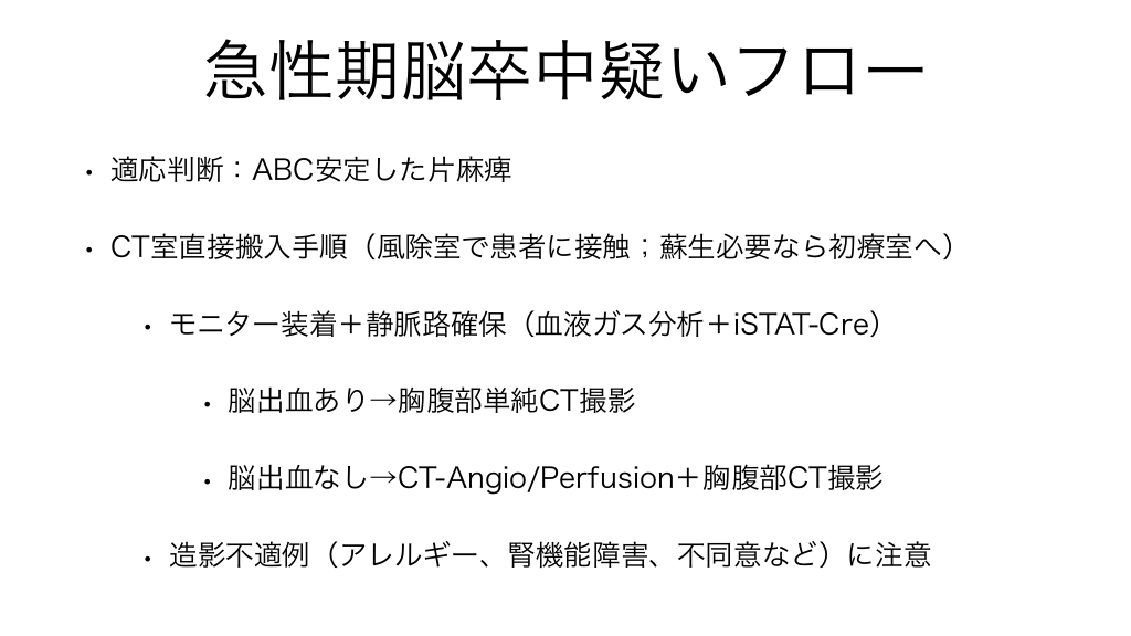 #6. 急性期脳卒中疑いフロー • 適応判断:ABC安定した片麻痺 • CT室直接搬入手順(風除室で患者に接触;蘇生必要なら初療室へ) • • モニター装着+静脈路確保(血液ガス分析+iSTAT-Cre) • 脳出血あり→胸腹部単純CT撮影 • 脳出血なし→CT-Angio/Perfusion+胸腹部CT撮影 造影不適例(アレルギー、腎機能障害、不同意など)に注意