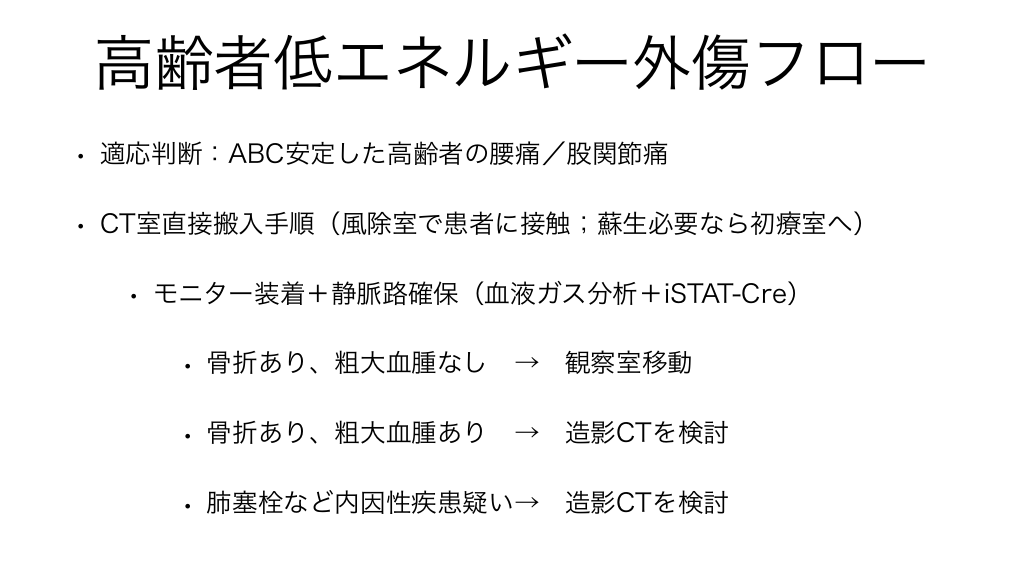 #7. 高齢者低エネルギー外傷フロー • 適応判断:ABC安定した高齢者の腰痛/股関節痛 • CT室直接搬入手順(風除室で患者に接触;蘇生必要なら初療室へ) • モニター装着+静脈路確保(血液ガス分析+iSTAT-Cre) • 骨折あり、粗大血腫なし → 観察室移動 • 骨折あり、粗大血腫あり → 造影CTを検討 • 肺塞栓など内因性疾患疑い→ 造影CTを検討