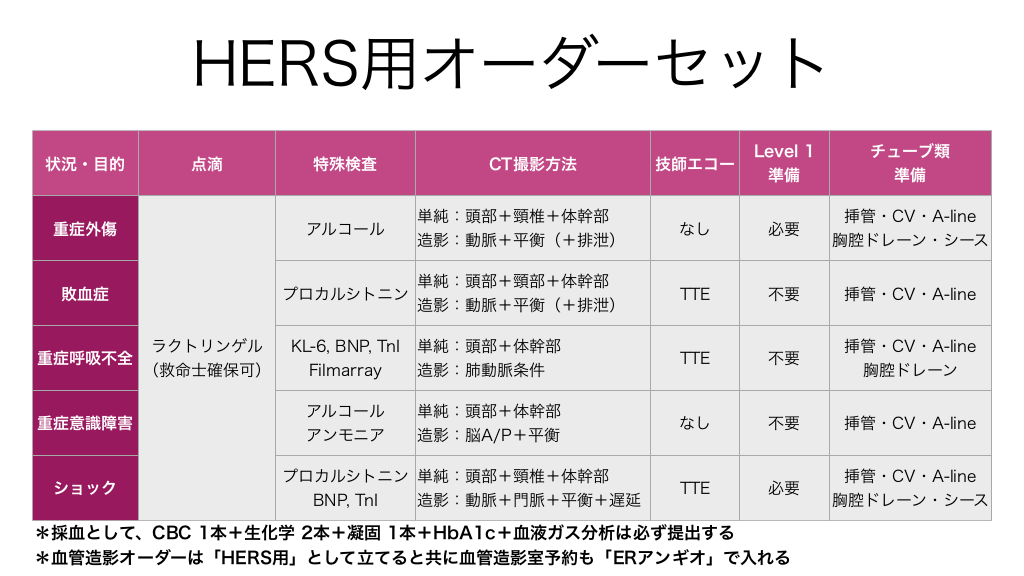 #8. HERS用オーダーセット 状況・目的 点滴 重症外傷 敗血症 ラクトリンゲル 重症呼吸不全 (救命士確保可) 重症意識障害 ショック 特殊検査 アルコール プロカルシトニン CT撮影方法 単純:頭部+頸椎+体幹部 造影:動脈+平衡(+排泄) 単純:頭部+頸部+体幹部 造影:動脈+平衡(+排泄) Level 1 準備 チューブ類 準備 なし 必要 挿管・CV・A-line 胸腔ドレーン・シース TTE 不要 挿管・CV・A-line 技師エコー KL-6, BNP, TnI Filmarray 単純:頭部+体幹部 造影:肺動脈条件 TTE 不要 挿管・CV・A-line 胸腔ドレーン アルコール アンモニア 単純:頭部+体幹部 造影:脳A/P+平衡 なし 不要 挿管・CV・A-line 必要 挿管・CV・A-line 胸腔ドレーン・シース プロカルシトニン 単純:頭部+頸椎+体幹部 BNP, TnI 造影:動脈+門脈+平衡+遅延 TTE *採血として、CBC 1本+生化学 2本+凝固 1本+HbA1c+血液ガス分析は必ず提出する *血管造影オーダーは「HERS用」として立てると共に血管造影室予約も「ERアンギオ」で入れる