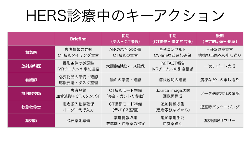 #9. HERS診療中のキーアクション Brie ng 初期 (受入〜CT撮影) 中期 (CT撮影〜決定的治療) 後期 (決定的治療〜退室) 救急医 患者情報の共有 CT撮影タイミング宣言 ABC安定化の処置 CT撮影の宣言 各科コンサルト CV-lineなど追加確保 HERS退室宣言 病棟担当医への申し送り 放射線科医 撮影条件の微調整 IVRチームへの事前連絡 大腿動静脈シース確保 (m)FACT報告 IVRチームへの引き継ぎ 一次レポート完成 看護師 必要物品の準備・確認 応援要請・タスク整理 輸血の準備・確認 病状説明の確認 病棟などへの申し送り Source image送信 画像再構成 データ送信忘れの確認 放射線技師 救急救命士 fi 薬剤師 患者登録 CT撮影モード準備 血管造影+CTスタンバイ (寝台・ガントリ移動) 患者搬入動線確保 オーダー代行入力 CT撮影モード準備 (デバイス整理) 追加情報収集 (患者家族などから) 退室時パッケージング 必要薬剤準備 薬剤情報収集 拮抗剤・治療薬の提案 追加薬剤手配 持参薬鑑別 薬剤情報サマリー
