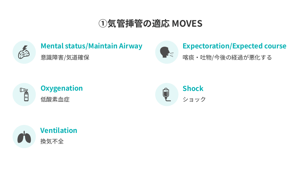 #2. ①気管挿管の適応 MOVES Mental status/Maintain Airway Expectoration/Expected course Oxygenation Shock 意識障害/気道確保 低酸素血症 Ventilation 換気不全 喀痰・吐物/今後の経過が悪化する ショック