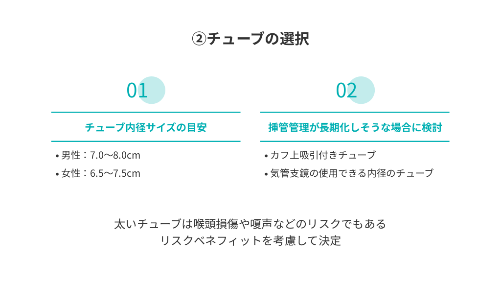 #3. ②チューブの選択 01 チューブ内径サイズの目安 男性:7.0~8.0cm 女性:6.5~7.5cm 02 挿管管理が長期化しそうな場合に検討 カフ上吸引付きチューブ 気管支鏡の使用できる内径のチューブ 太いチューブは喉頭損傷や嗄声などのリスクでもある リスクベネフィットを考慮して決定