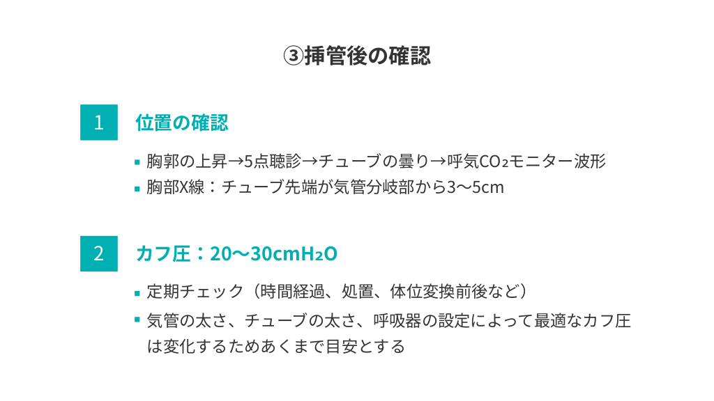 #4. ③挿管後の確認 1 位置の確認 胸郭の上昇→5点聴診→チューブの曇り→呼気CO₂モニター波形 胸部X線:チューブ先端が気管分岐部から3~5cm 2 カフ圧:20~30cmH₂O 定期チェック(時間経過、処置、体位変換前後など) 気管の太さ、チューブの太さ、呼吸器の設定によって最適なカフ圧 は変化するためあくまで目安とする