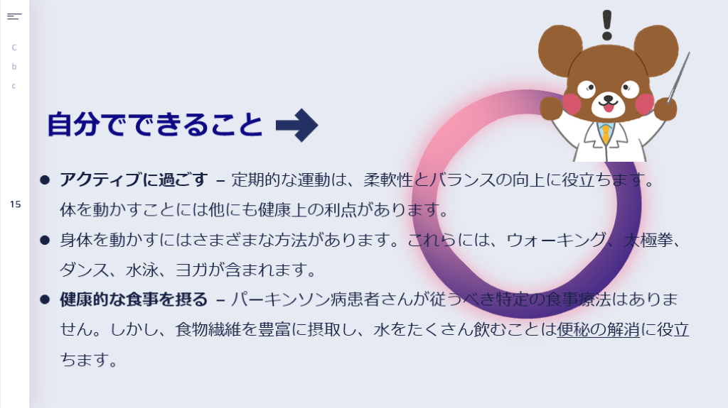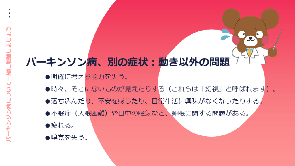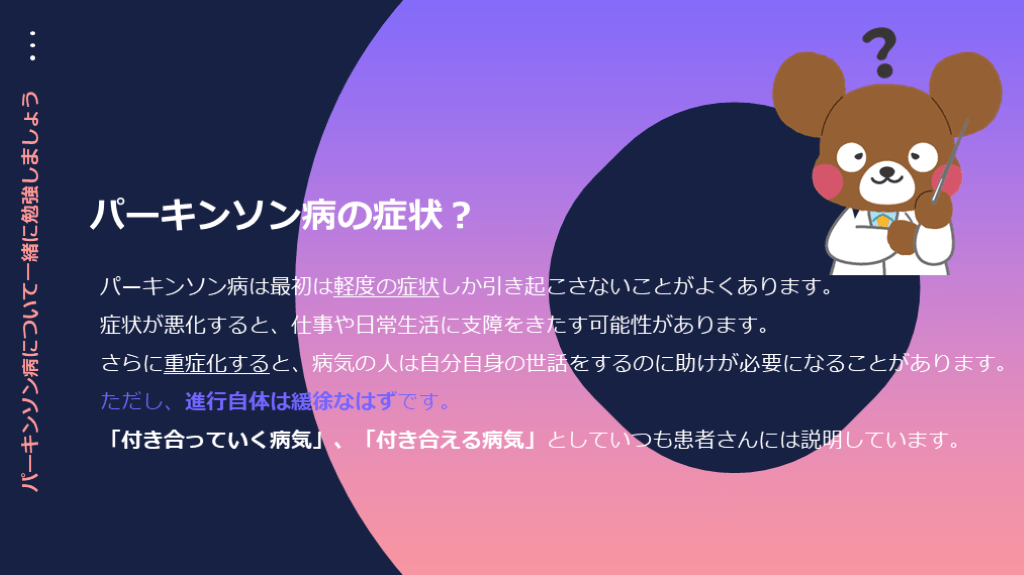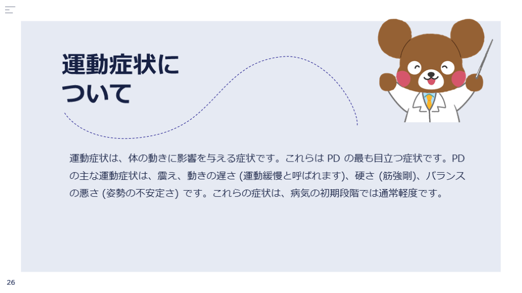 パーキンソン病による症状を知ることで、現在の状態をうまく担当医に伝えることができるようになるでしょう。