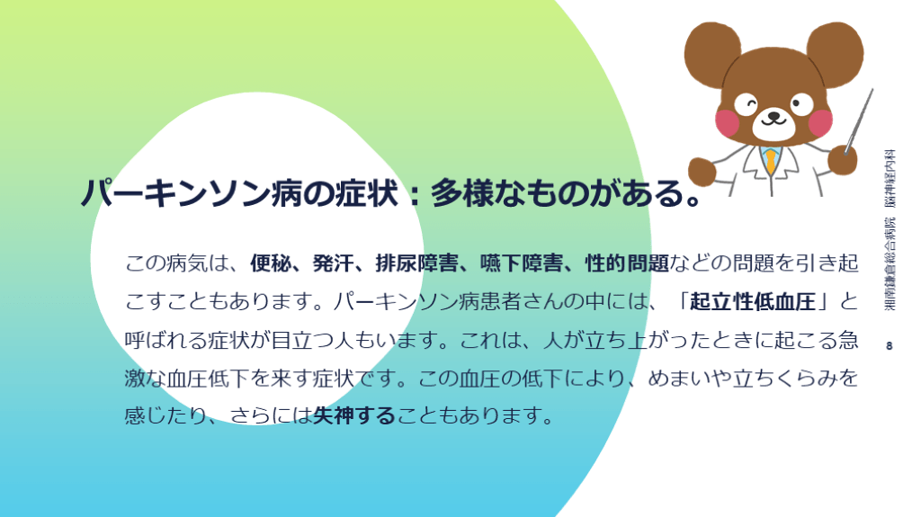 #8. https://unsplash.com/photos/SYbD0jfSF3s パーキンソン病の症状:多様なものがある。 この病気は、便秘、発汗、排尿障害、嚥下障害、性的問題などの問題を引き起こすこともあります。パーキンソン病患者さんの中には、「起立性低血圧」と呼ばれる症状が目立つ人もいます。これは、人が立ち上がったときに起こる急激な血圧低下を来す症状です。この血圧の低下により、めまいや立ちくらみを感じたり、さらには失神することもあります。