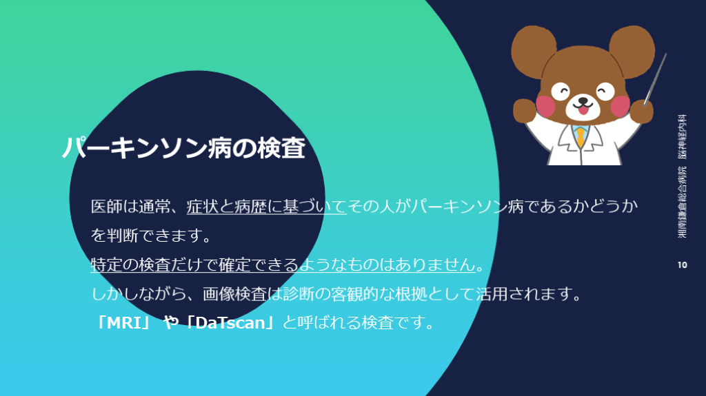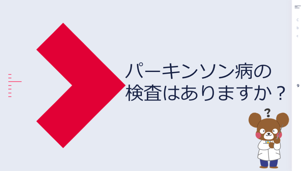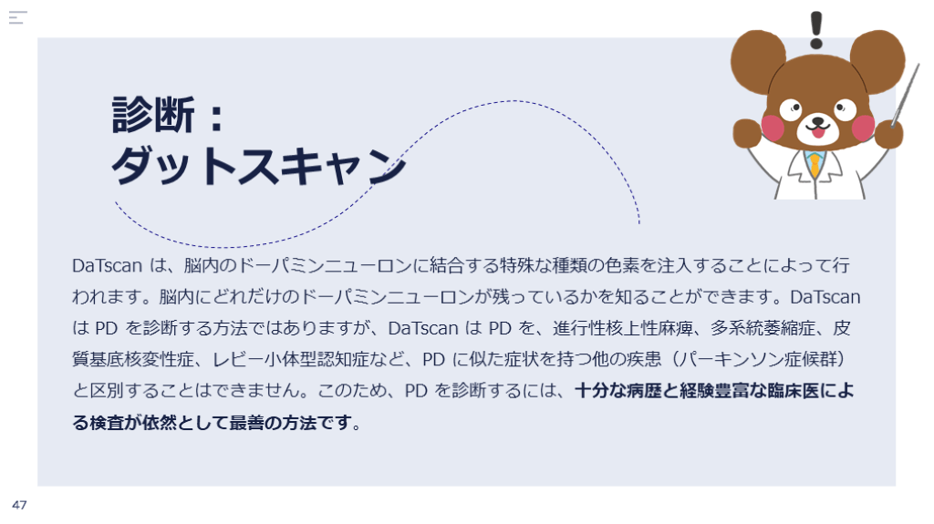 ダットスキャン DaTscan は、脳内のドーパミンニューロンに結合する特殊な種類の色素を注入することによって行われます。脳内にどれだけのドーパミンニューロンが残っているかを知ることができます。DaTscan は PD を診断する方法ではありますが、DaTscan は PD を、進行性核上性麻痺、多系統萎縮症、皮質基底核変性症、レビー小体型認知症など、PD に似た症状を持つ他の疾患(パーキンソン症候群)と区別することはできません。このため、PD を診断するには、十分な病歴と経験豊富な臨床医による検査が依然として最善の方法です。
