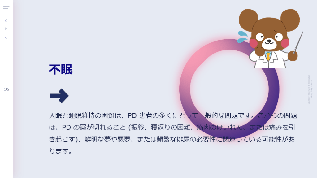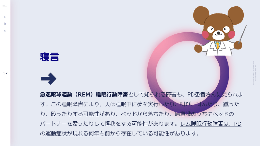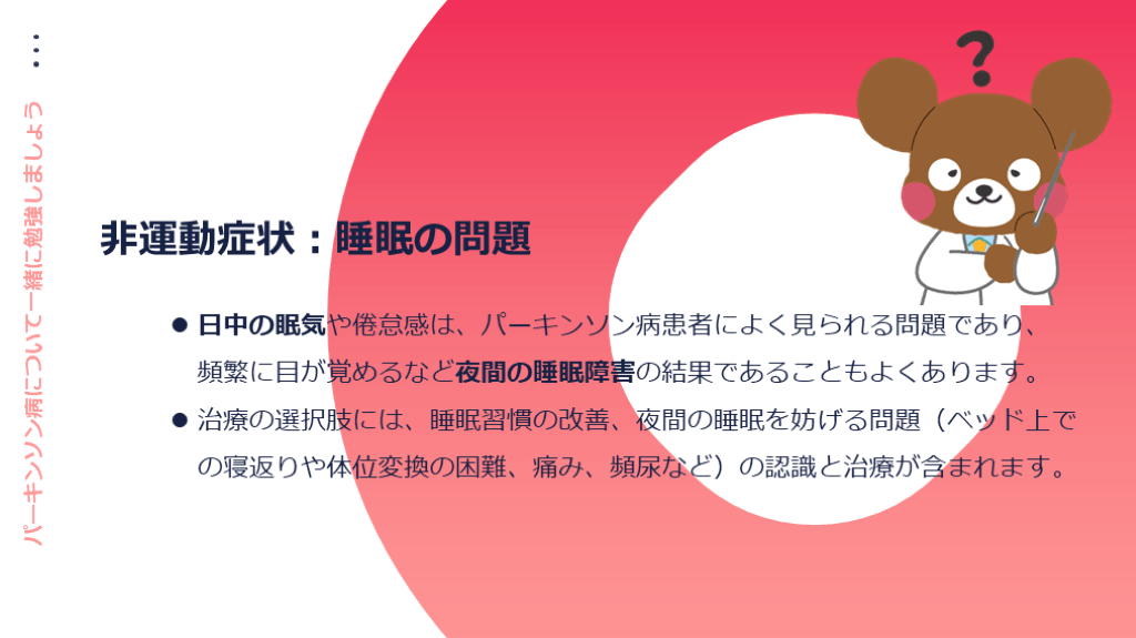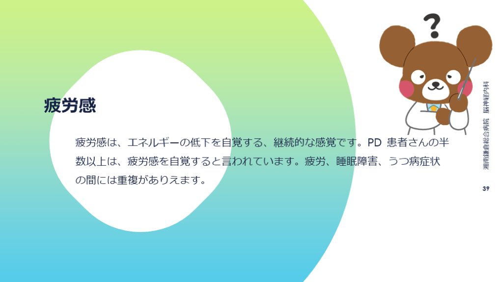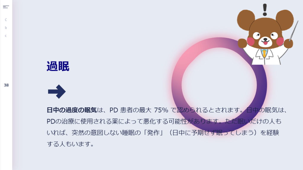 #38. 過眠 日中の過度の眠気は、PD 患者の最大 75% で認められるとされます。日中の眠気は、PDの治療に使用される薬によって悪化する可能性があります。ただ眠いだけの人もいれば、突然の意図しない睡眠の「発作」(日中に予期せず眠ってしまう)を経験する人もいます。
