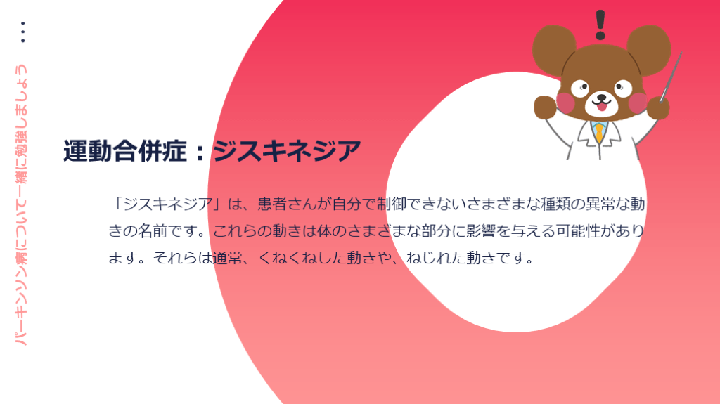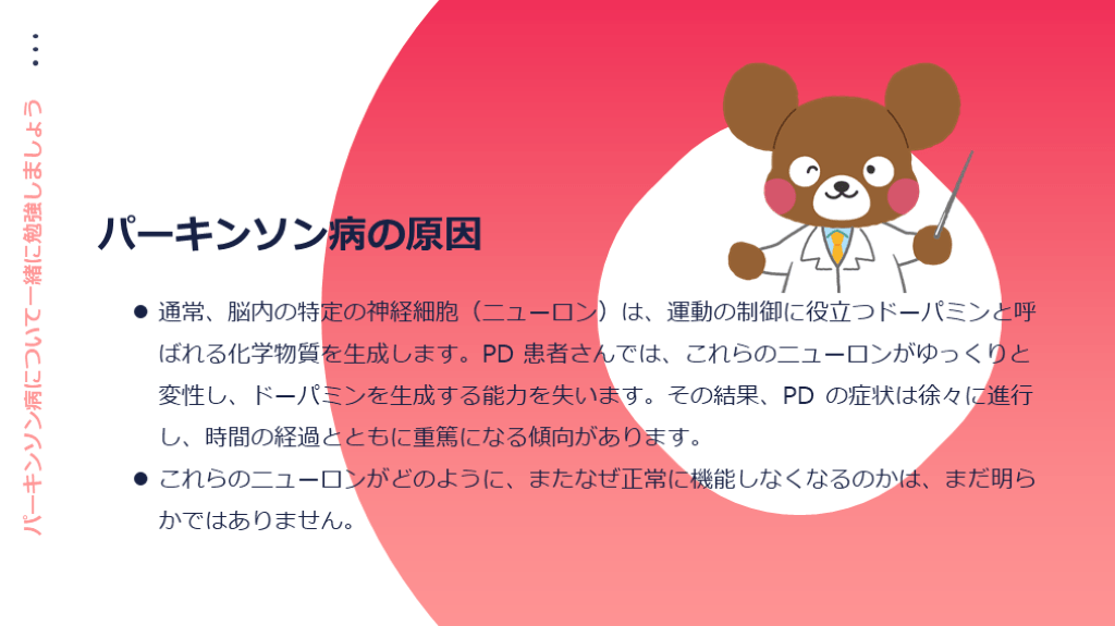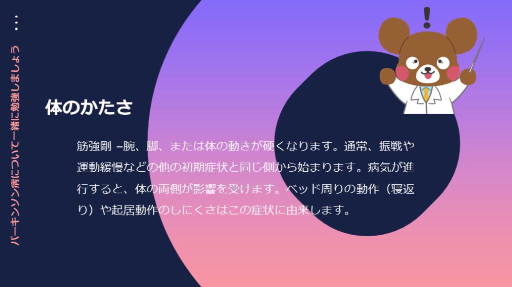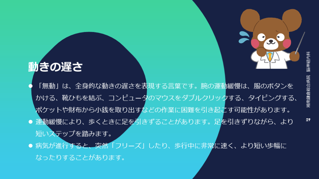 ついて 通常、症状は体の片側で始まり、数年かけて反対側に広がります。症状が悪化すると、歩いたり、話したり、その他の通常の日常生活を行うことが困難になる場合があります。症状は通常ゆっくりと進行しますが、これは人によって異なります。