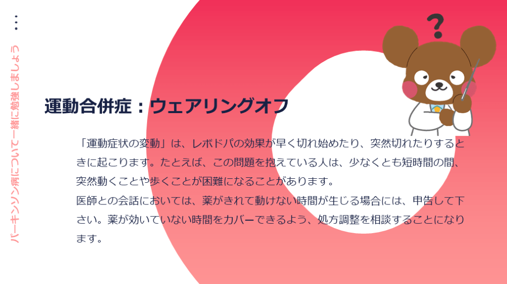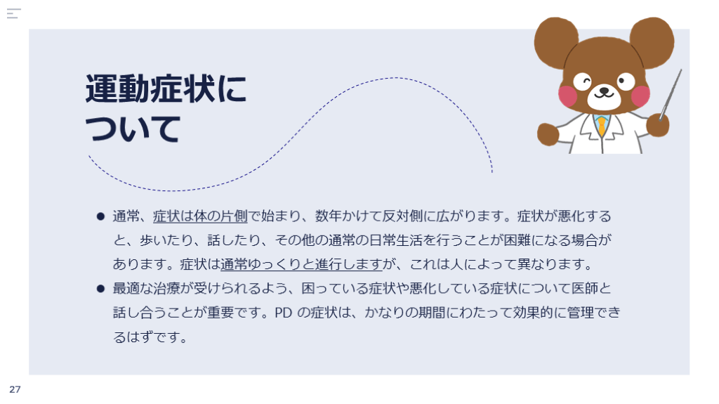 最適な治療が受けられるよう、困っている症状や悪化している症状について医師と話し合うことが重要です。PD の症状は、かなりの期間にわたって効果的に管理できるはずです。