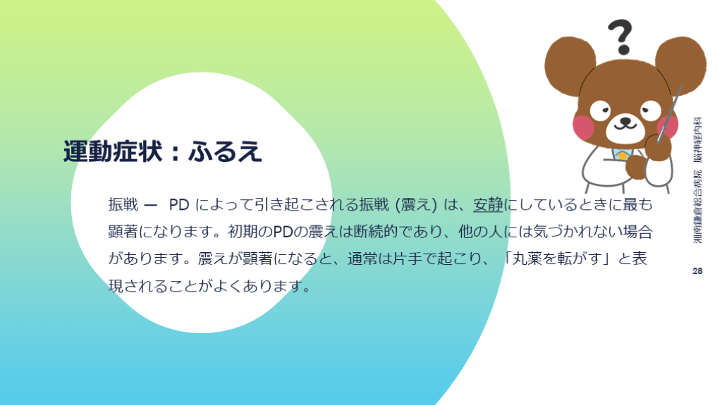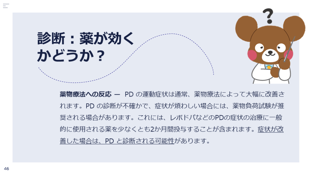 #46. 診断:薬が効くかどうか? 薬物療法への反応 — PD の運動症状は通常、薬物療法によって大幅に改善されます。PD の診断が不確かで、症状が煩わしい場合には、薬物負荷試験が推奨される場合があります。これには、レボドパなどのPDの症状の治療に一般的に使用される薬を少なくとも2か月間投与することが含まれます。症状が改善した場合は、PD と診断される可能性があります。