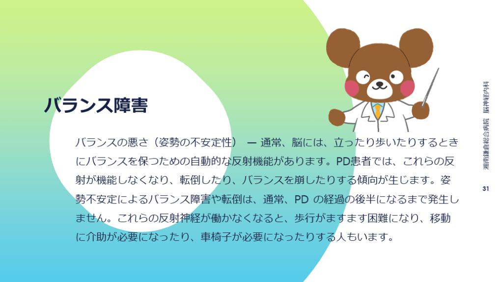 #31. https://unsplash.com/photos/SYbD0jfSF3s バランス障害 バランスの悪さ(姿勢の不安定性) — 通常、脳には、立ったり歩いたりするときにバランスを保つための自動的な反射機能があります。PD患者では、これらの反射が機能しなくなり、転倒したり、バランスを崩したりする傾向が生じます。姿勢不安定によるバランス障害や転倒は、通常、PD の経過の後半になるまで発生しません。これらの反射神経が働かなくなると、歩行がますます困難になり、移動に介助が必要になったり、車椅子が必要になったりする人もいます。