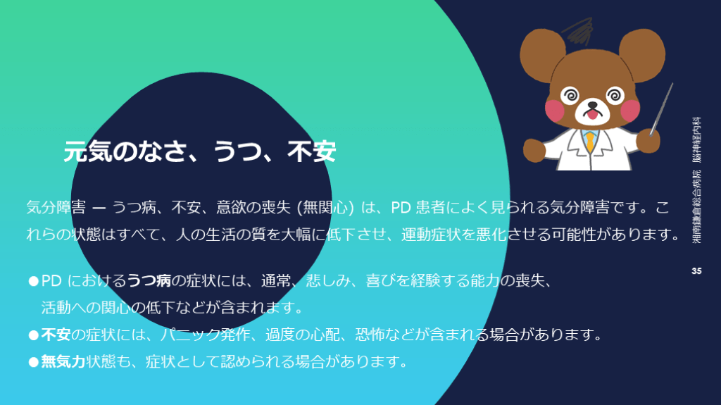 ●PD におけるうつ病の症状には、通常、悲しみ、喜びを経験する能力の喪失、