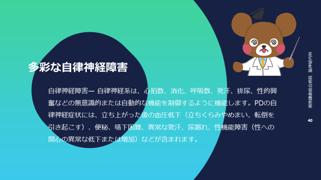 #40. https://unsplash.com/photos/SYbD0jfSF3s 多彩な自律神経障害 自律神経障害— 自律神経系は、心拍数、消化、呼吸数、発汗、排尿、性的興奮などの無意識的または自動的な機能を制御するように機能します。PDの自律神経症状には、立ち上がった後の血圧低下(立ちくらみやめまい、転倒を引き起こす)、便秘、嚥下困難、異常な発汗、尿漏れ、性機能障害(性への関心の異常な低下または増加)などが含まれます。