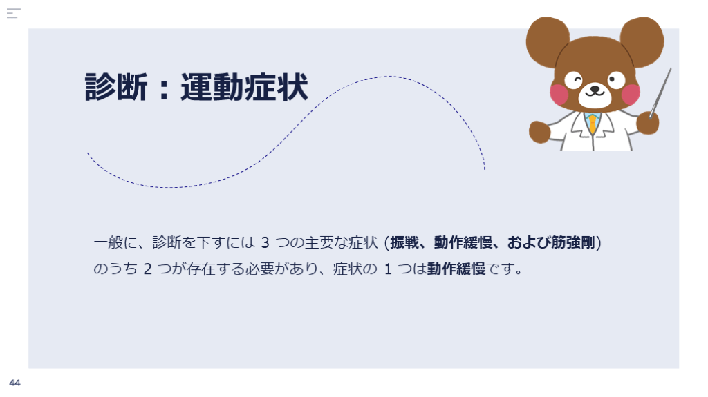 #44. 診断:運動症状 一般に、診断を下すには 3 つの主要な症状 (振戦、動作緩慢、および筋強剛) のうち 2 つが存在する必要があり、症状の 1 つは動作緩慢です。