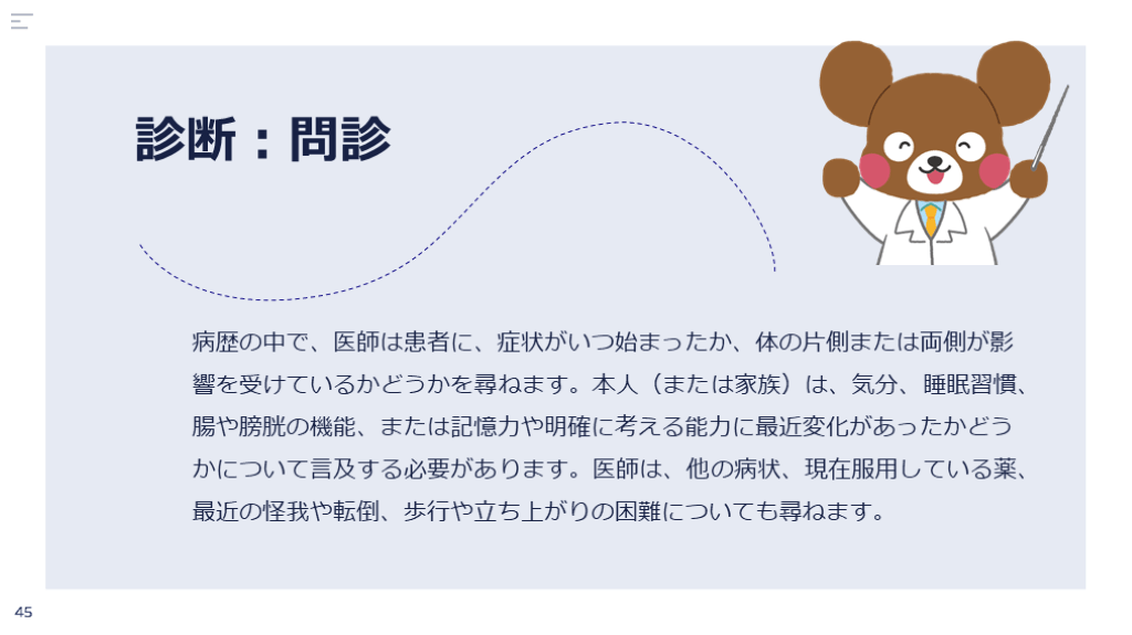 #45. 診断:問診 病歴の中で、医師は患者に、症状がいつ始まったか、体の片側または両側が影響を受けているかどうかを尋ねます。本人(または家族)は、気分、睡眠習慣、腸や膀胱の機能、または記憶力や明確に考える能力に最近変化があったかどうかについて言及する必要があります。医師は、他の病状、現在服用している薬、最近の怪我や転倒、歩行や立ち上がりの困難についても尋ねます。