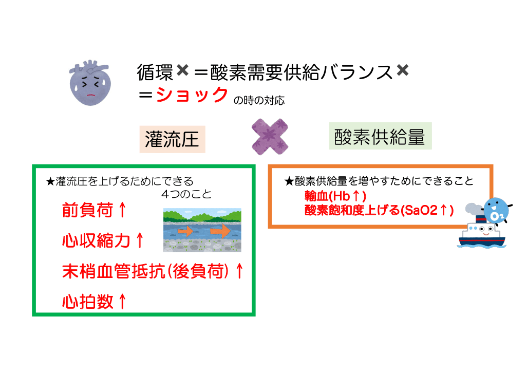 #10. 循環✖=酸素需要供給バランス✖ =ショック の時の対応 灌流圧 ★灌流圧を上げるためにできる 4つのこと 前負荷↑ 心収縮力↑ 末梢血管抵抗(後負荷)↑ 心拍数↑ 酸素供給量 ★酸素供給量を増やすためにできること 輸血(Hb↑) 酸素飽和度上げる(SaO2↑)