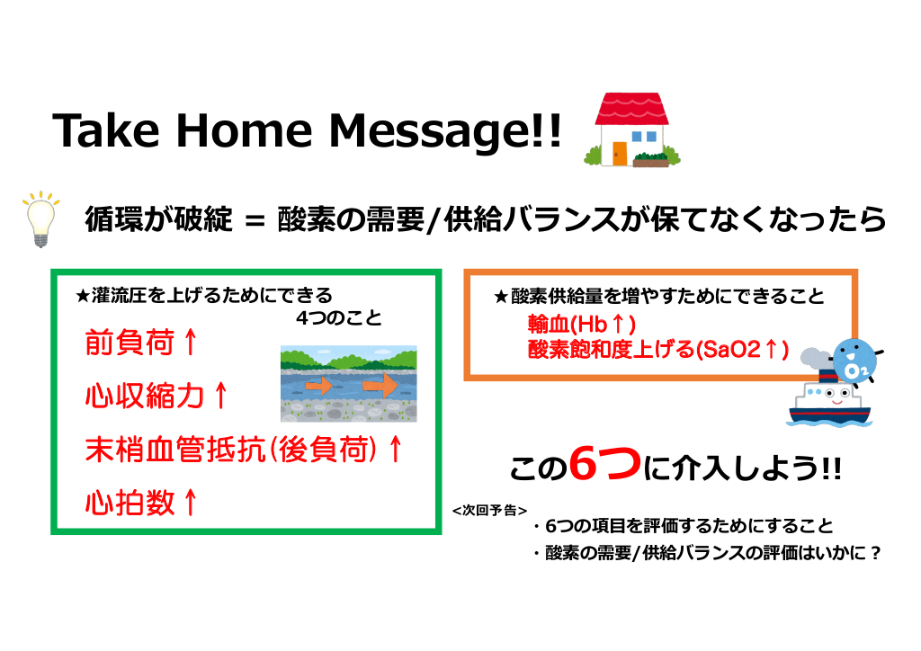 #11. Take Home Message!! 循環が破綻 = 酸素の需要/供給バランスが保てなくなったら ★灌流圧を上げるためにできる 4つのこと ★酸素供給量を増やすためにできること 輸血(Hb↑) 酸素飽和度上げる(SaO2↑) 前負荷↑ 心収縮力↑ 末梢血管抵抗(後負荷)↑ 心拍数↑ この6つに介⼊しよう!! <次回予告> ・6つの項⽬を評価するためにすること ・酸素の需要/供給バランスの評価はいかに︖