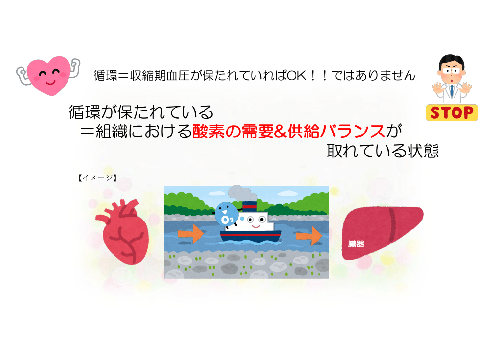 #2. 循環=収縮期血圧が保たれていればOK!!ではありません 循環が保たれている =組織における酸素の需要&供給バランスが 取れている状態 【イメージ】 臓器