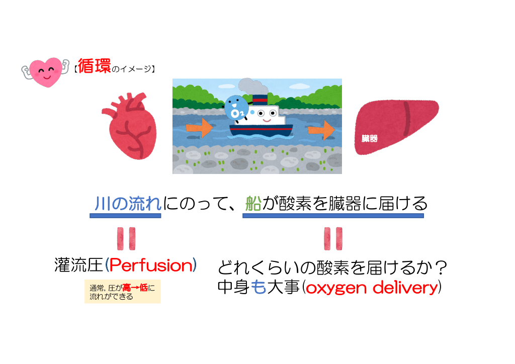 #3. 循環 のイメージ】 【 臓器 川の流れにのって、船が酸素を臓器に届ける 灌流圧(Perfusion) 通常, 圧が高→低に 流れができる どれくらいの酸素を届けるか? 中身も大事(oxygen delivery)