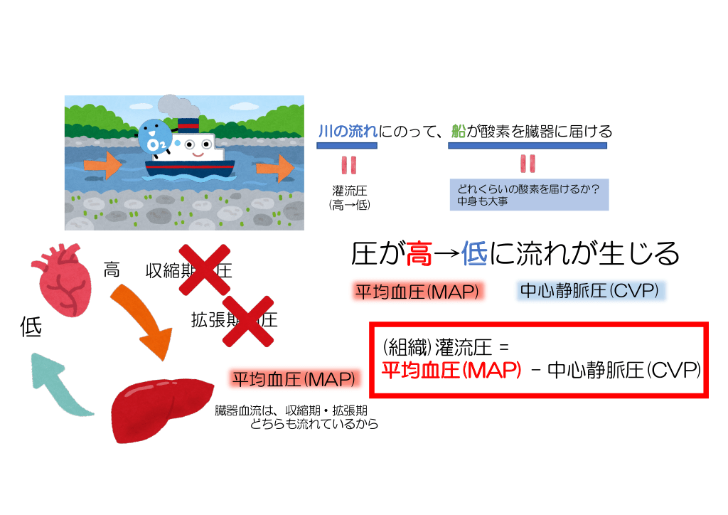 #5. 川の流れにのって、船が酸素を臓器に届ける 灌流圧 (高→低) 高 収縮期血圧 どれくらいの酸素を届けるか? 中身も大事 圧が高→低に流れが生じる 平均血圧(MAP) 低 中心静脈圧(CVP) 拡張期血圧 平均血圧(MAP) 臓器血流は、収縮期・拡張期 どちらも流れているから (組織)灌流圧 = 平均血圧(MAP) – 中心静脈圧(CVP)
