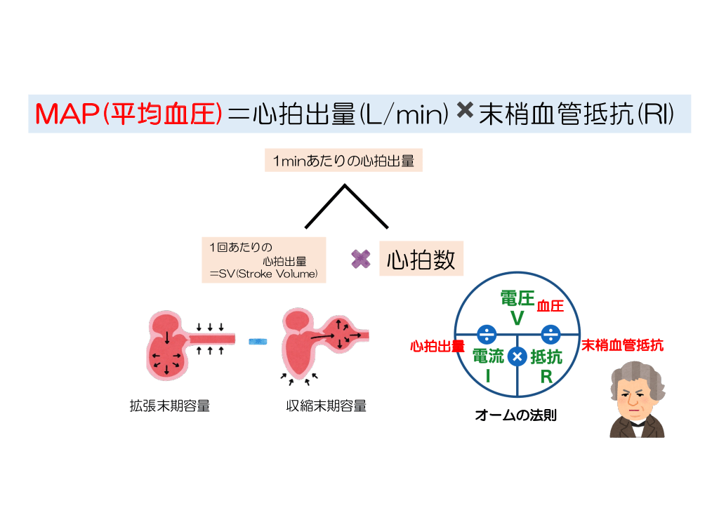 #6. MAP(平均血圧)=心拍出量(L/min)✖末梢血管抵抗(RI) 1minあたりの心拍出量 1回あたりの 心拍出量 =SV(Stroke Volume) 心拍数 血圧 末梢血管抵抗 心拍出量 拡張末期容量 収縮末期容量 オームの法則