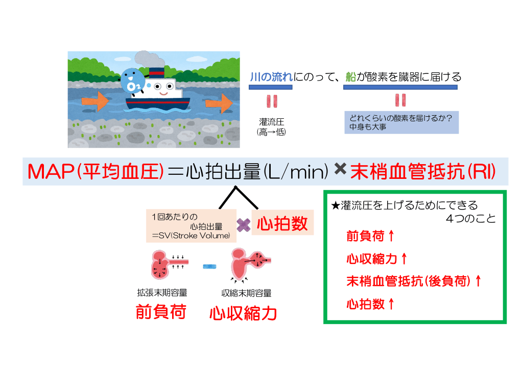 #7. 川の流れにのって、船が酸素を臓器に届ける 灌流圧 (高→低) どれくらいの酸素を届けるか? 中身も大事 MAP(平均血圧)=心拍出量(L/min)✖末梢血管抵抗(RI) 1回あたりの 心拍出量 心拍数 =SV(Stroke Volume) ★灌流圧を上げるためにできる 4つのこと 前負荷↑ 心収縮力↑ 末梢血管抵抗(後負荷)↑ 拡張末期容量 前負荷 収縮末期容量 心収縮力 心拍数↑