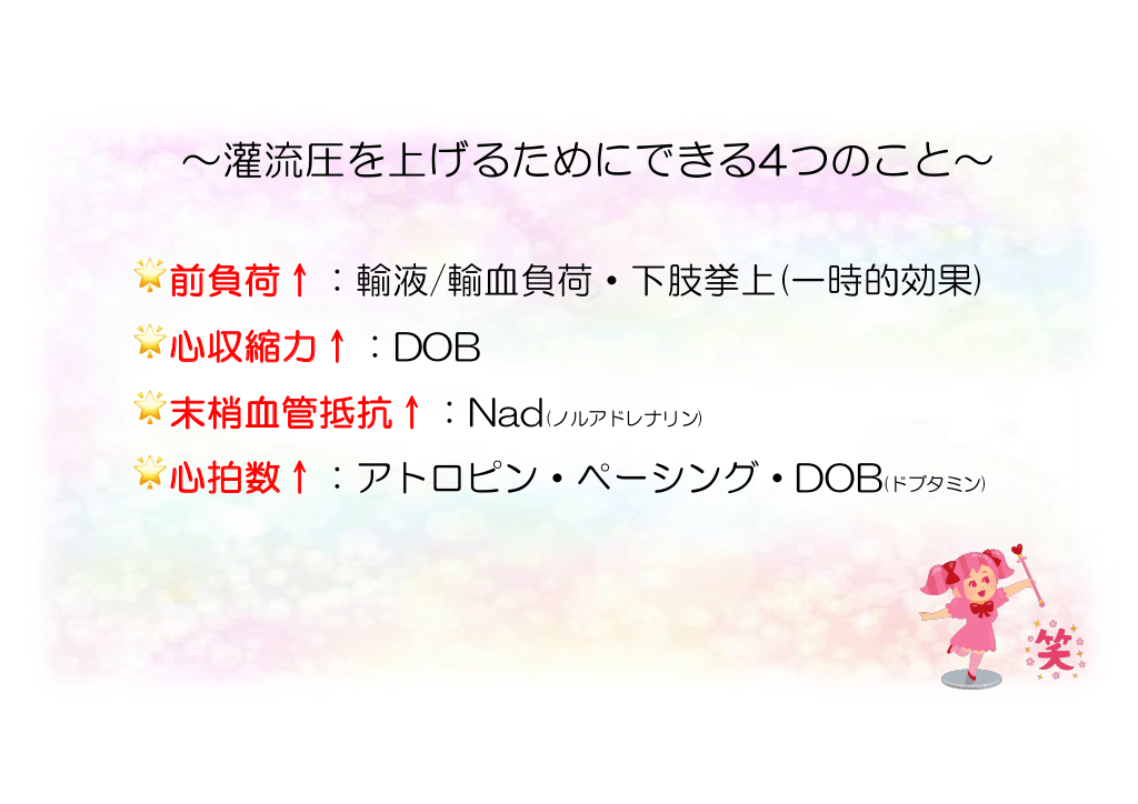 #8. 〜灌流圧を上げるためにできる4つのこと〜 🌟前負荷↑:輸液/輸血負荷・下肢挙上(一時的効果) 🌟心収縮力↑:DOB 🌟末梢血管抵抗↑:Nad(ノルアドレナリン) 🌟心拍数↑:アトロピン・ペーシング・DOB(ドブタミン)