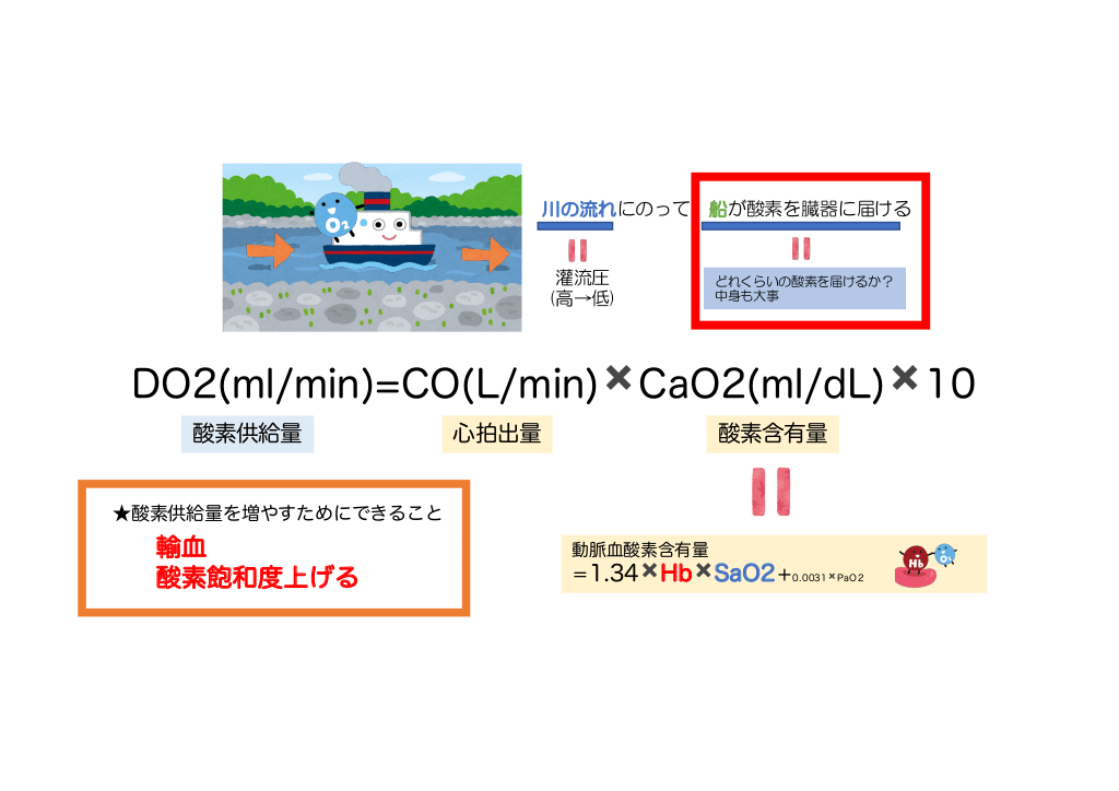 #9. 川の流れにのって、船が酸素を臓器に届ける 灌流圧 (高→低) どれくらいの酸素を届けるか? 中身も大事 DO2(ml/min)=CO(L/min)✖CaO2(ml/dL)✖10 酸素供給量 心拍出量 酸素含有量 ★酸素供給量を増やすためにできること 輸血 酸素飽和度上げる 動脈血酸素含有量 =1.34✖ Hb✖ SaO2+0.0031✖PaO2