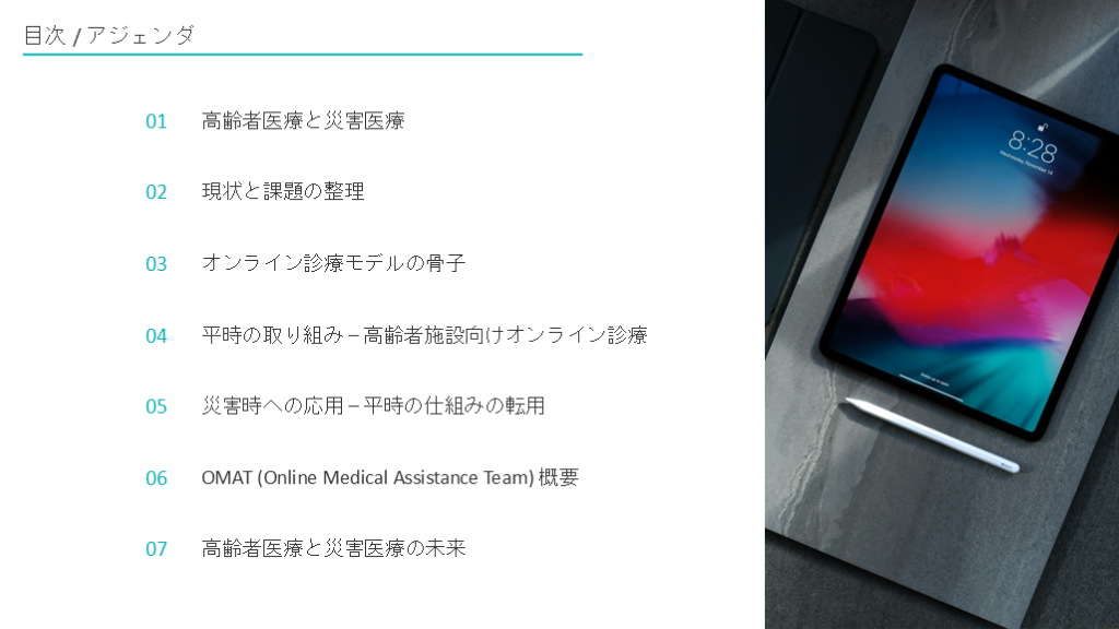 #2. 01 高齢者医療と災害医療 02 現状と課題の整理 03 オンライン診療モデルの骨子 04 平時の取り組み – 高齢者施設向けオンライン診療 05 災害時への応用 – 平時の仕組みの転用 06 OMAT (Online Medical Assistance Team) 概要 07 高齢者医療と災害医療の未来 目次 / アジェンダ