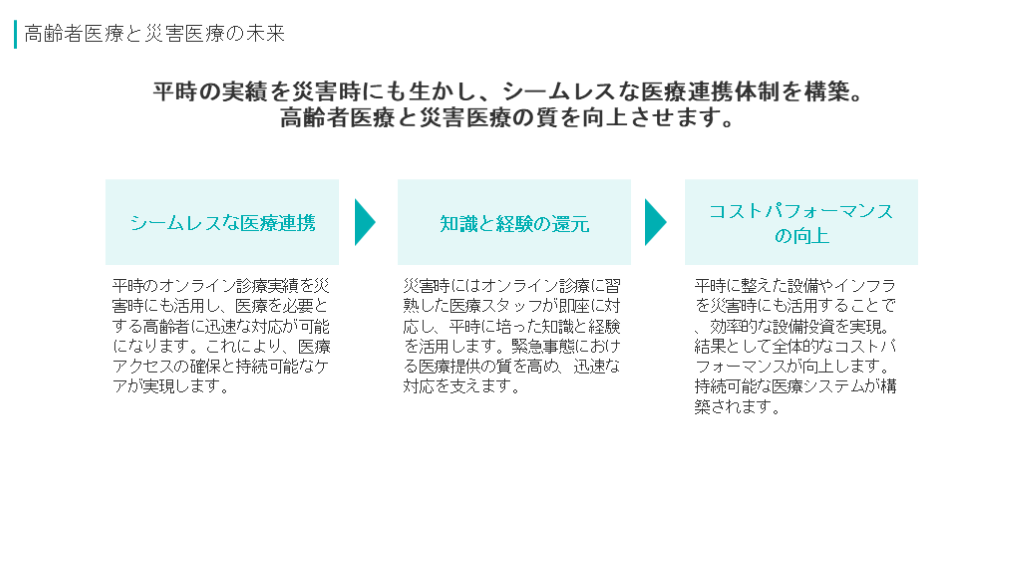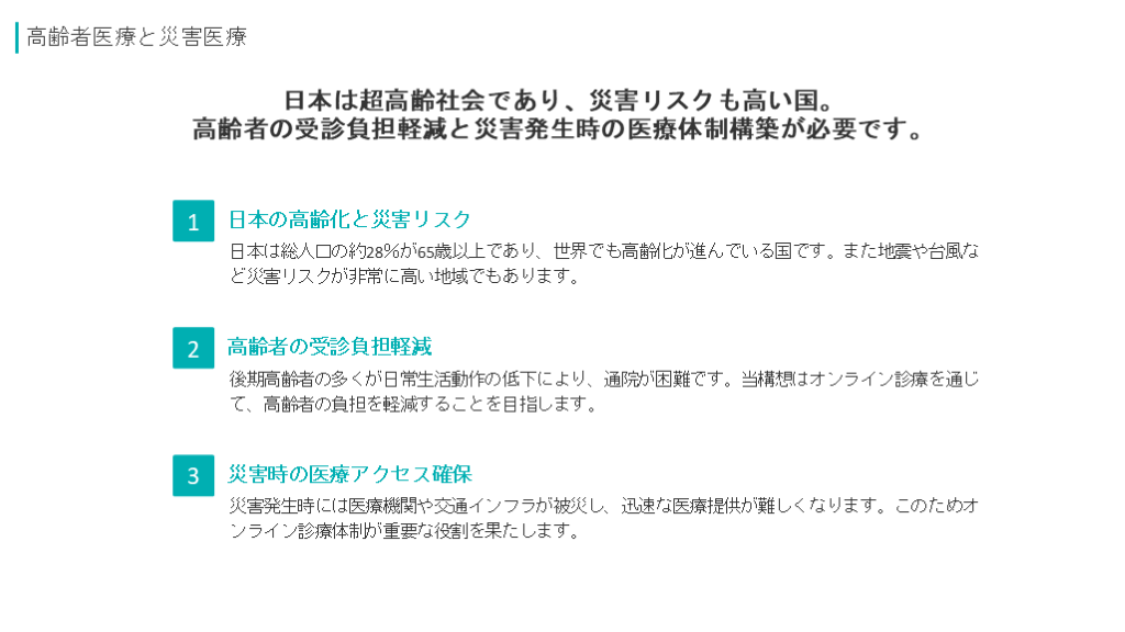 #3. 災害発生時には医療機関や交通インフラが被災し、迅速な医療提供が難しくなります。このためオンライン診療体制が重要な役割を果たします。 災害時の医療アクセス確保 3 後期高齢者の多くが日常生活動作の低下により、通院が困難です。当構想はオンライン診療を通じて、高齢者の負担を軽減することを目指します。 高齢者の受診負担軽減 2 日本は総人口の約28%が65歳以上であり、世界でも高齢化が進んでいる国です。また地震や台風など災害リスクが非常に高い地域でもあります。 日本の高齢化と災害リスク 1 高齢者医療と災害医療 日本は超高齢社会であり、災害リスクも高い国。