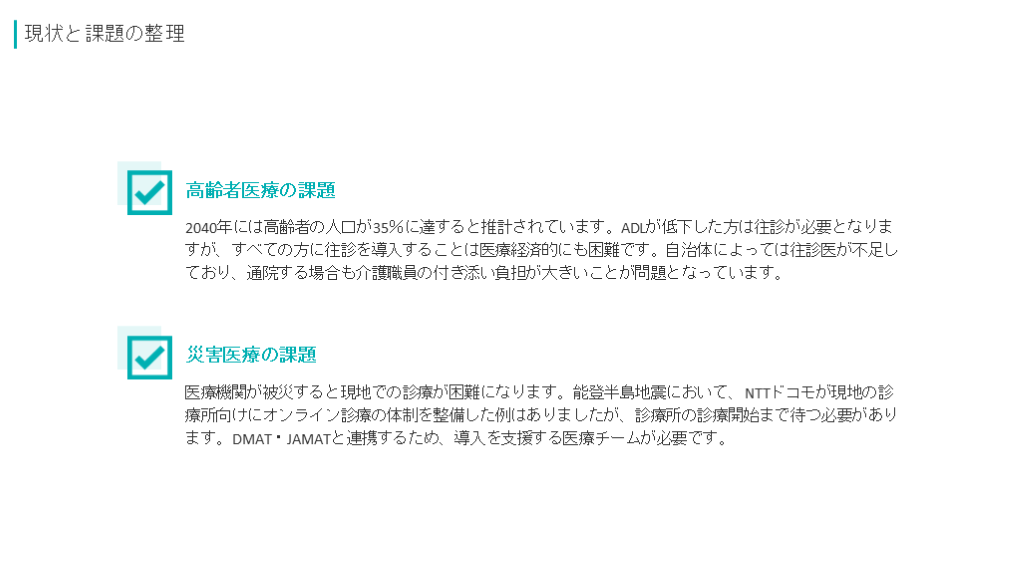#4. 医療機関が被災すると現地での診療が困難になります。能登半島地震において、NTTドコモが現地の診療所向けにオンライン診療の体制を整備した例はありましたが、診療所の診療開始まで待つ必要があります。DMAT・JAMATと連携するため、導入を支援する医療チームが必要です。 災害医療の課題 2040年には高齢者の人口が35%に達すると推計されています。ADLが低下した方は往診が必要となりますが、すべての方に往診を導入することは医療経済的にも困難です。自治体によっては往診医が不足しており、通院する場合も介護職員の付き添い負担が大きいことが問題となっています。 高齢者医療の課題 現状と課題の整理