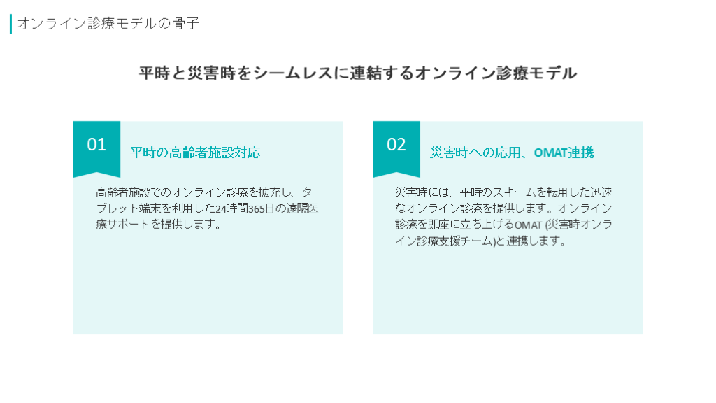 #5. 01 平時の高齢者施設対応 高齢者施設でのオンライン診療を拡充し、タブレット端末を利用した24時間365日の遠隔医療サポートを提供します。 02 災害時への応用、OMAT連携 災害時には、平時のスキームを転用した迅速なオンライン診療を提供します。オンライン診療を即座に立ち上げるOMAT (災害時オンライン診療支援チーム)と連携します。 オンライン診療モデルの骨子 平時と災害時をシームレスに連結するオンライン診療モデル