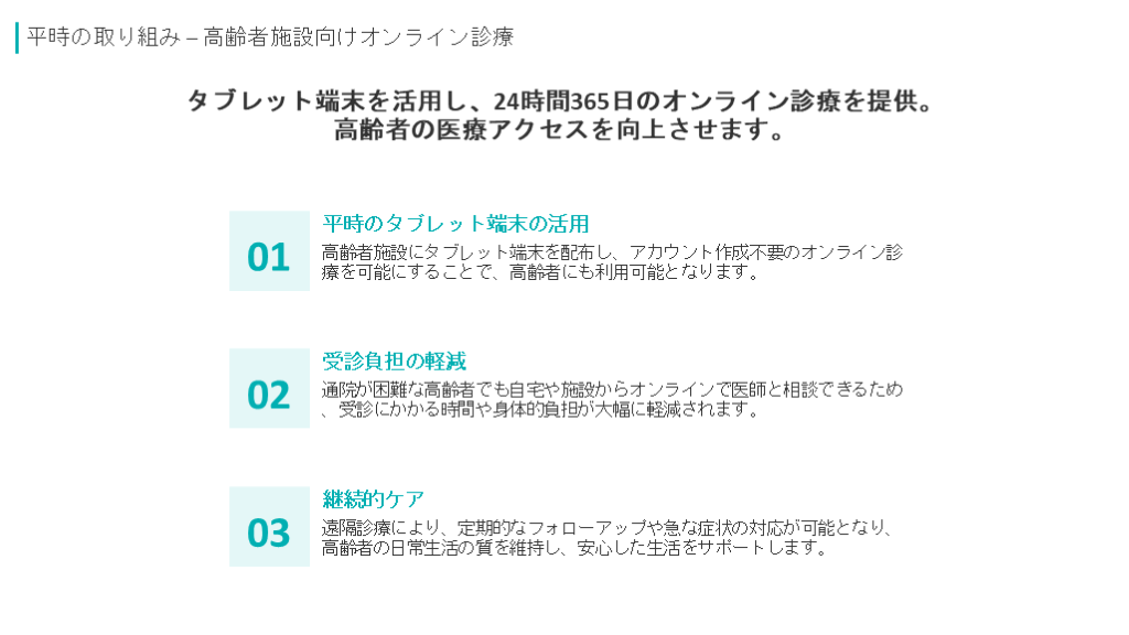 #6. 03 継続的ケア 遠隔診療により、定期的なフォローアップや急な症状の対応が可能となり、高齢者の日常生活の質を維持し、安心した生活をサポートします。 02 受診負担の軽減 通院が困難な高齢者でも自宅や施設からオンラインで医師と相談できるため、受診にかかる時間や身体的負担が大幅に軽減されます。 01 平時のタブレット端末の活用 高齢者施設にタブレット端末を配布し、アカウント作成不要のオンライン診療を可能にすることで、高齢者にも利用可能となります。 平時の取り組み – 高齢者施設向けオンライン診療 タブレット端末を活用し、24時間365日のオンライン診療を提供。