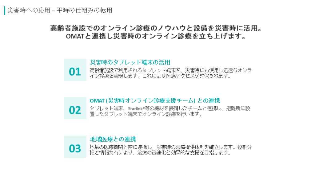 #7. 03 地域医療との連携 地域の医療機関と密に連携し、災害時の医療提供体制を確立します。役割分担と情報共有により、治療の迅速化と効果的な支援を目指します。 02 OMAT (災害時オンライン診療支援チーム) との連携 タブレット端末、Starlink®等の機材を装備したチームと連携し、避難所に設置したタブレット端末でオンライン診療を行います。 01 災害時のタブレット端末の活用 高齢者施設で利用されるタブレット端末を、災害時にも使用し迅速なオンライン診療を実現します。これにより医療アクセスが確保されます。 災害時への応用 – 平時の仕組みの転用 高齢者施設でのオンライン診療のノウハウと設備を災害時に活用。
