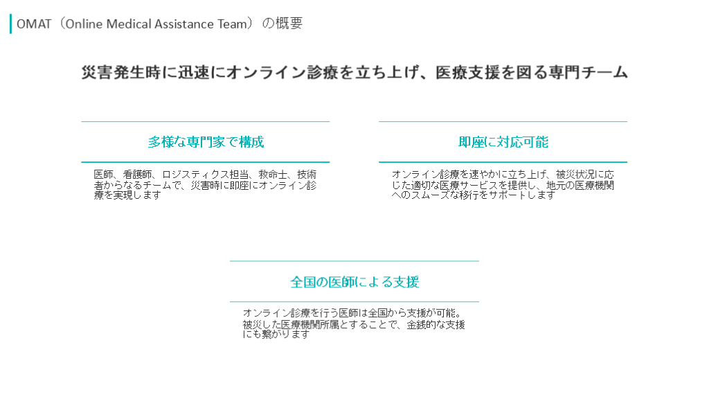 #8. 全国の医師による支援 オンライン診療を行う医師は全国から支援が可能。 被災した医療機関所属とすることで、金銭的な支援にも繋がります 即座に対応可能 オンライン診療を速やかに立ち上げ、被災状況に応じた適切な医療サービスを提供し、地元の医療機関へのスムーズな移行をサポートします 多様な専門家で構成 医師、看護師、ロジスティクス担当、救命士、技術者からなるチームで、災害時に即座にオンライン診療を実現します OMAT(Online Medical Assistance Team)の概要 災害発生時に迅速にオンライン診療を立ち上げ、医療支援を図る専門チーム