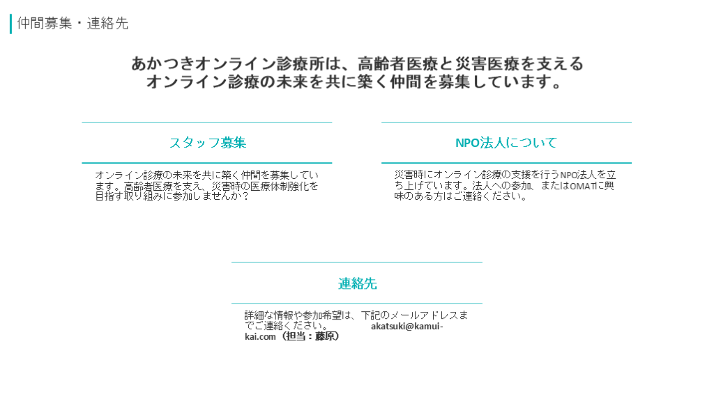 #10. 連絡先 詳細な情報や参加希望は、下記のメールアドレスまでご連絡ください。 akatsuki@kamui-kai.com(担当:藤原) NPO法人について 災害時にオンライン診療の支援を行うNPO法人を立ち上げています。法人への参加、またはOMATに興味のある方はご連絡ください。 スタッフ募集 オンライン診療の未来を共に築く仲間を募集しています。高齢者医療を支え、災害時の医療体制強化を目指す取り組みに参加しませんか? 仲間募集・連絡先 あかつきオンライン診療所は、高齢者医療と災害医療を支える