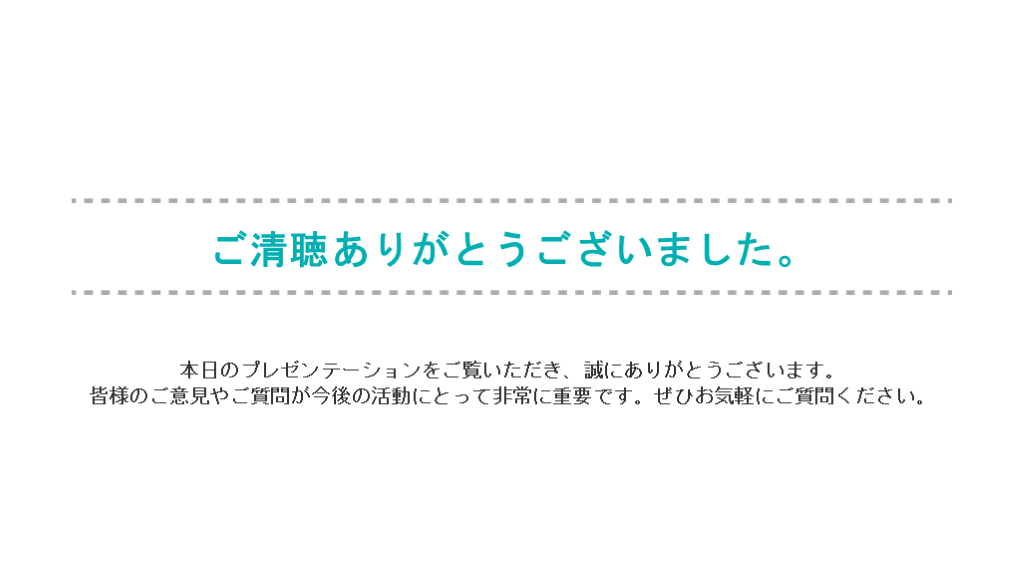 皆様のご意見やご質問が今後の活動にとって非常に重要です。ぜひお気軽にご質問ください。 ご清聴ありがとうございました。