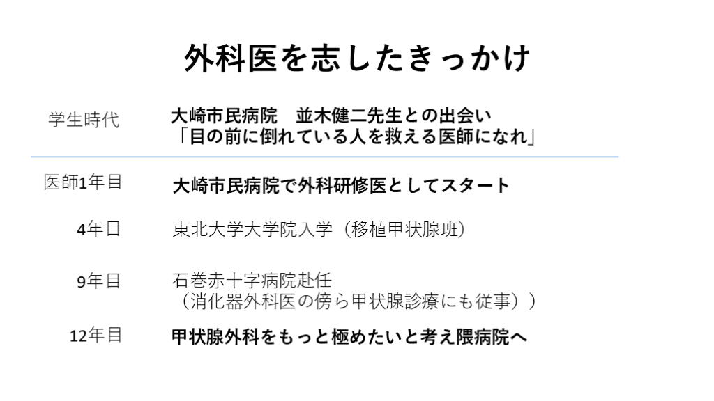 (消化器外科医の傍ら甲状腺診療にも従事)) 学生時代 医師1年目 4年目 9年目 12年目 東北大学大学院入学(移植甲状腺班)