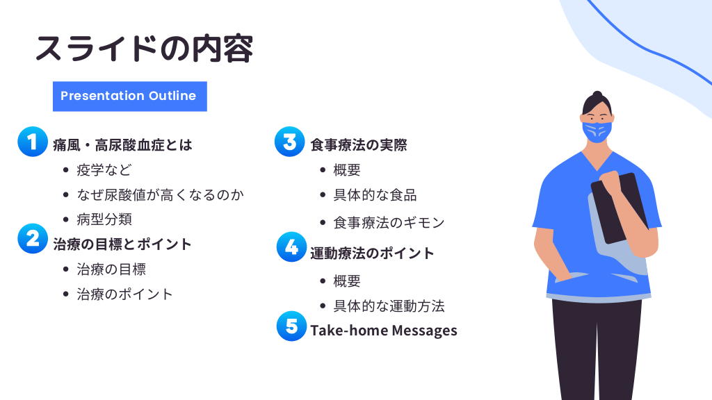 #2. スライドの内容 Presentation Outline 痛風・高尿酸血症とは 食事療法の実際 疫学など 概要 なぜ尿酸値が高くなるのか 具体的な食品 病型分類 食事療法のギモン 治療の目標とポイント 治療の目標 治療のポイント 運動療法のポイント 概要 具体的な運動方法 Take-home Messages