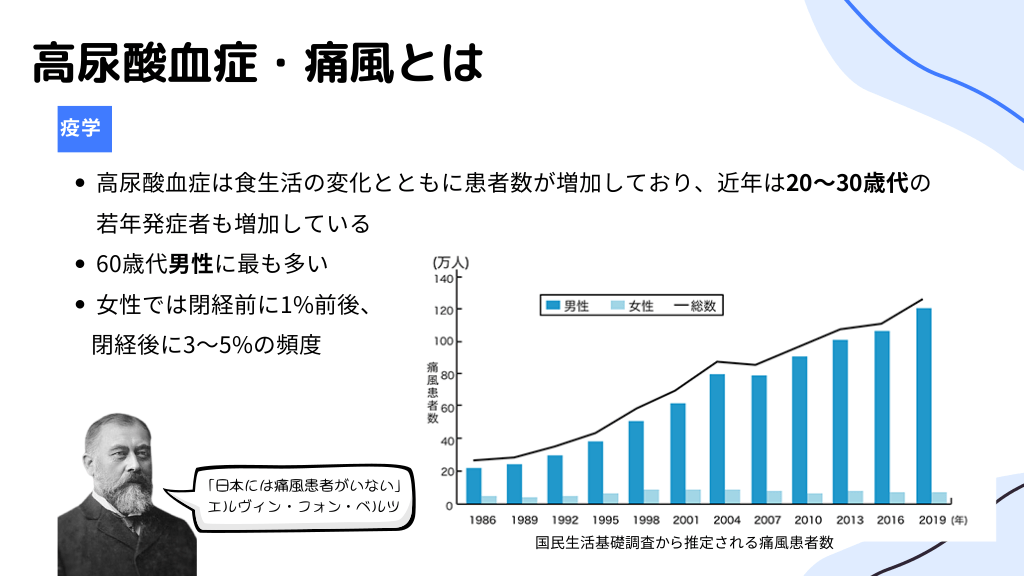 #3. 高尿酸血症・痛風とは 疫学 高尿酸血症は食生活の変化とともに患者数が増加しており、近年は20~30歳代の 若年発症者も増加している 60歳代男性に最も多い 女性では閉経前に1%前後、 閉経後に3~5%の頻度 「日本には痛風患者がいない」 エルヴィン・フォン・ベルツ 国民生活基礎調査から推定される痛風患者数