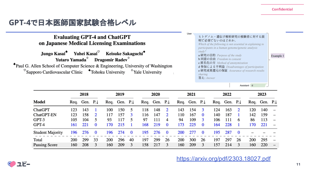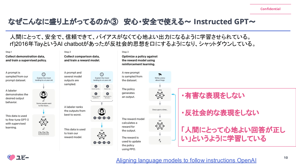 Confidential なぜこんなに盛り上がってるのか③ 安心・安全で使える〜 Instructed GPT〜 人間にとって、安全で、信頼できて、バイアスがなくて心地よい出力になるように学習させられている。 rf)2016年TayというAI chatbotがあったが反社会的思想を口にするようになり、シャットダウンしている。 ・有害な表現をしない ・反社会的な表現をしない 「人間にとって心地よい回答が正し い」というように学習している Aligning language models to follow instructions OpenAI 10 AIの医療分野における活用事例 #13.