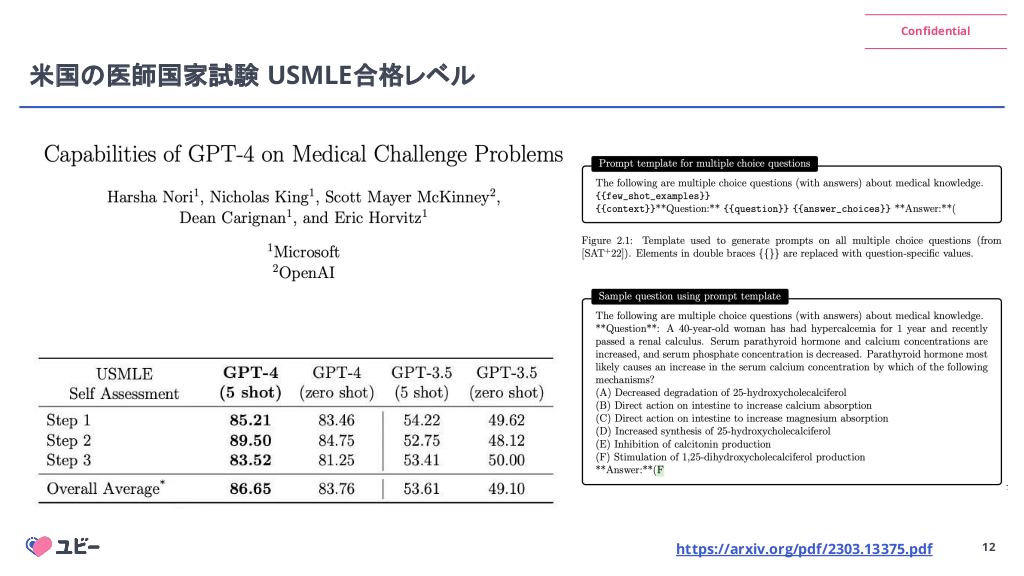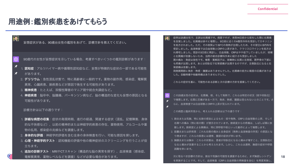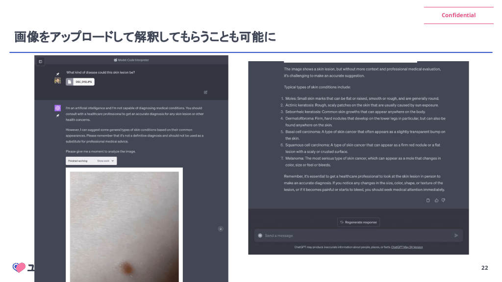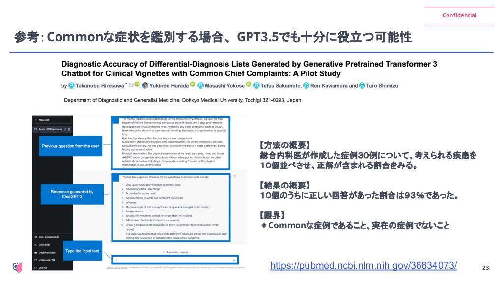 Confidential 画像をアップロードして解釈してもらうことも可能に 22 #23. Confidential 参考:Commonな症状を鑑別する場合、 GPT3.5でも十分に役立つ可能性 【方法の概要】 総合内科医が作成した症例30例について、考えられる疾患を 10個並べさせ、正解が含まれる割合をみる。 【結果の概要】 10個のうちに正しい回答があった割合は93%であった。 【限界】 *Commonな症例であること、実在の症例でないこと https://pubmed.ncbi.nlm.nih.gov/36834073/ 23 #24.