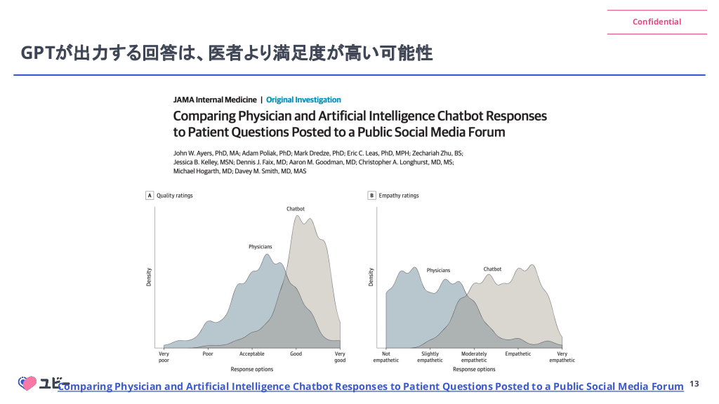 Confidential GPTが出力する回答は、医者より満足度が高い可能性 Comparing Physician and Artificial Intelligence Chatbot Responses to Patient Questions Posted to a Public Social Media Forum 13 ChatGPTの機能と注意点 #14.