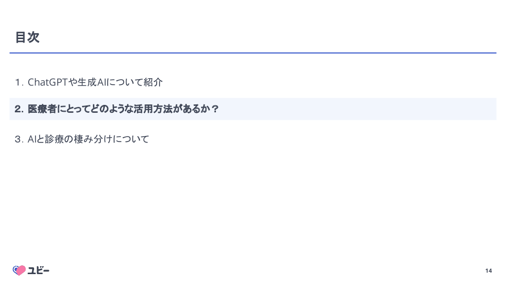 目次 1.ChatGPTや生成AIについて紹介 2.医療者にとってどのような活用方法があるか? 3.AIと診療の棲み分けについて 14 #15.