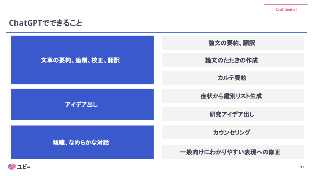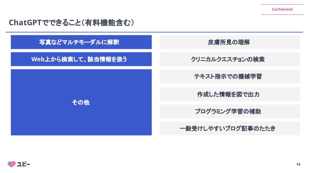 Confidential ChatGPTでできること 論文の要約、翻訳 文章の要約、添削、校正、翻訳 論文のたたきの作成 カルテ要約 症状から鑑別リスト生成 アイデア出し 研究アイデア出し カウンセリング 傾聴、なめらかな対話 一般向けにわかりやすい表現への修正 15 #16.