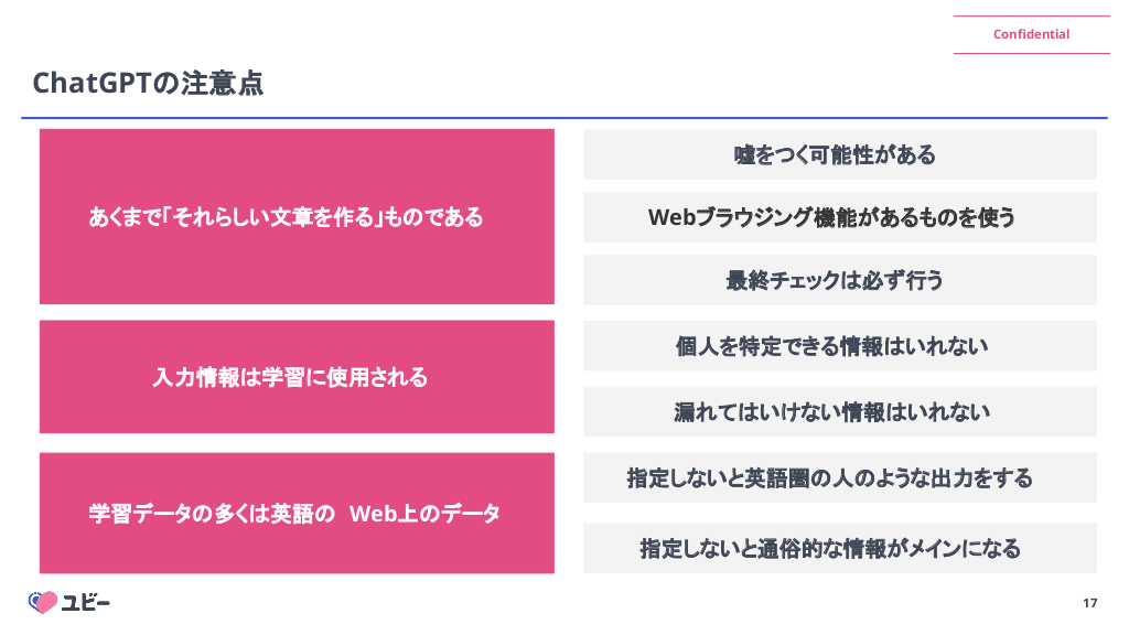Confidential ChatGPTの注意点 嘘をつく可能性がある あくまで「それらしい文章を作る」ものである Webブラウジング機能があるものを使う 最終チェックは必ず行う 個人を特定できる情報はいれない 入力情報は学習に使用される 漏れてはいけない情報はいれない 指定しないと英語圏の人のような出力をする 学習データの多くは英語の Web上のデータ 指定しないと通俗的な情報がメインになる 17 #18.
