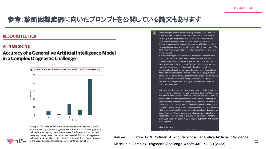 Confidential 参考:診断困難症例に向いたプロンプトを公開している論文もあります Kanjee, Z., Crowe, B. & Rodman, A. Accuracy of a Generative Artificial Intelligence Model in a Complex Diagnostic Challenge. JAMA 330, 78–80 (2023) 20 #21.