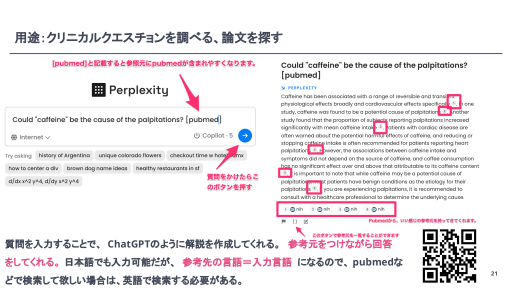 用途:クリニカルクエスチョンを調べる、論文を探す 質問を入力することで、 ChatGPTのように解説を作成してくれる。 参考元をつけながら回答 をしてくれる。 日本語でも入力可能だが、 参考先の言語=入力言語 になるので、 pubmedな どで検索して欲しい場合は、英語で検索する必要がある。 21 #22.